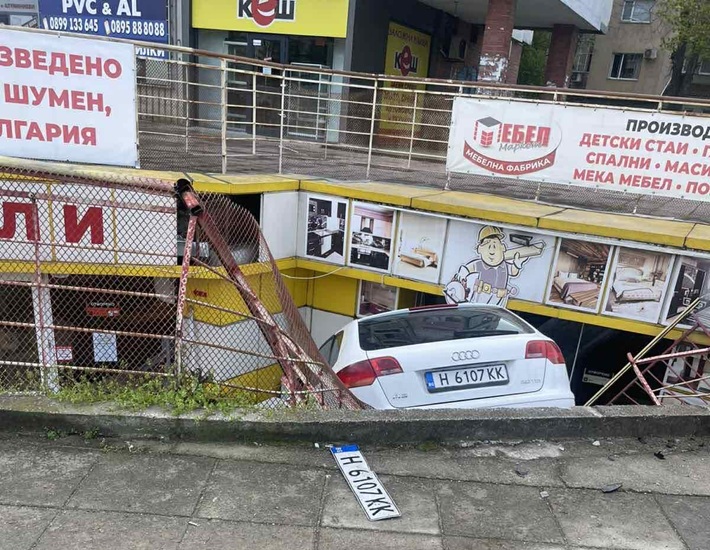 Автомобил едва не влетя в магазин след удар с друга кола