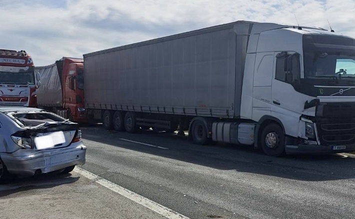 Временна организация на АМ“ Хемус“ посока Варна – София, на около 300 м преди етапна връзка за Шумен. Жена, която била зад волана на лек автомобил Мерцедес с варненска регистрация, се движила в ускорителната лента на магистралата. Спряла рязко, като движещите се зад нея водачи на два тежкотоварни автомобила не успели да спрат навреме. В задната част на лекия автомобил се ударил водач на Волво, а в него се ударил тежкотоварен автомобил МАН с украинска регистрация. За преглед в болницата е откарана жената, която управлявала лекия автомобил. Контактна е. Всички водачи са правоспособни. Екипи на пътна полиция и АПИ регулират движението. Молим водачите да шофират внимателно.